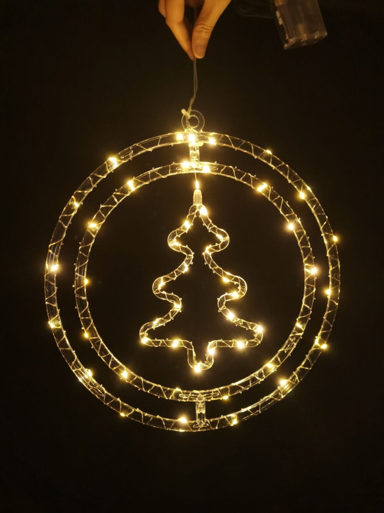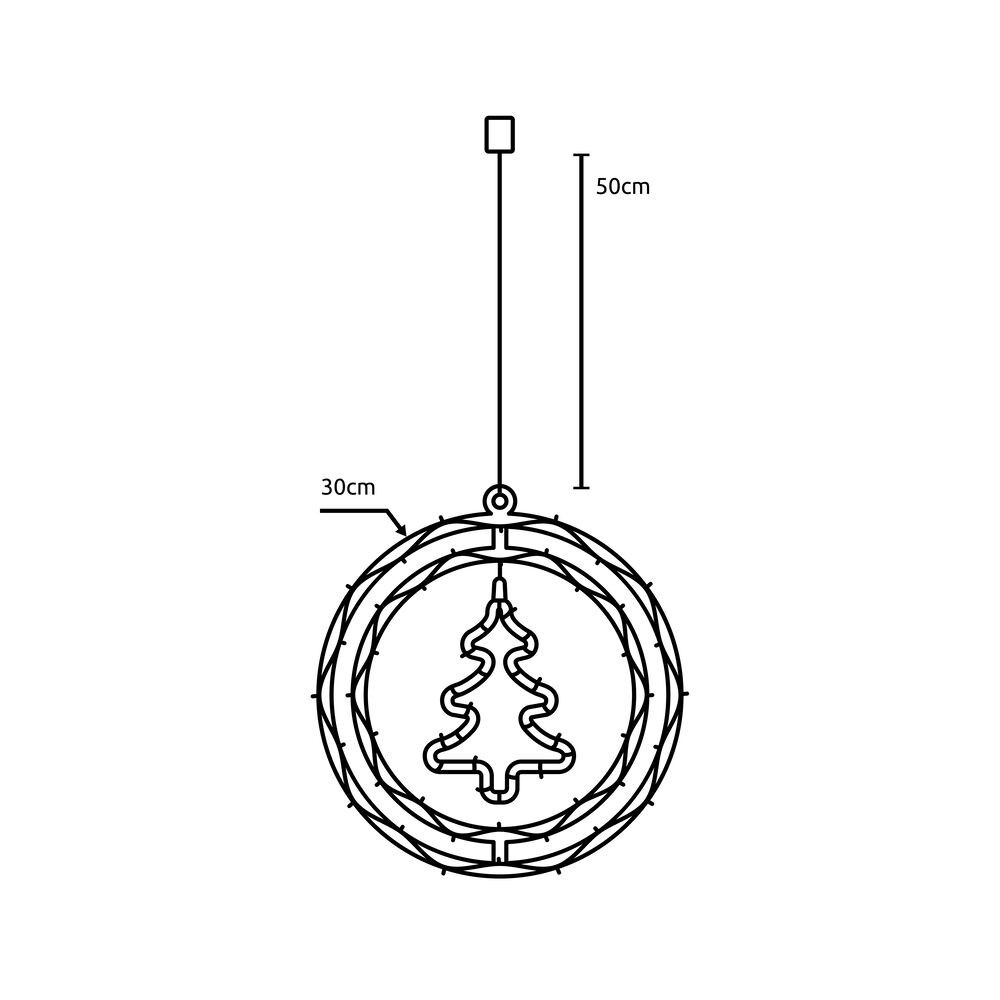 Méreteit tekintve 80centiméter hosszú és összesen 48 LED chip van rászerelve. A 30 cm átmérőjű, karácsonyfát ábrázoló LED dekorációhoz egy 50 cm hosszúságú kábellel csatlakozik az elemtartó egység, amely 3 darab AA (ceruza) méretű elemmel működtethető. Megfelelő minőségű és kapacitású elemek használatával a dekoráció akár 3 napig is képes folyamatos világításra.