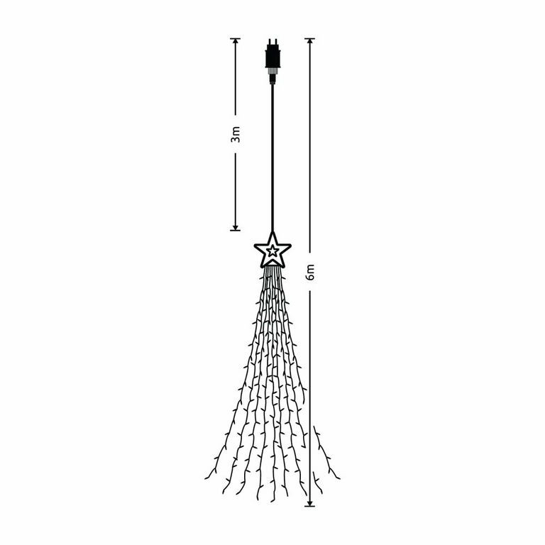 A fényfüzér teljes hossza 6 méter, amelynek közepén egy nagy, világító csillag található. Ebből lógnak le a 3 méter hosszú fénykábelek, amelyeken összesen 300 darab energiatakarékos LED chip biztosítja a ragyogó fényt.